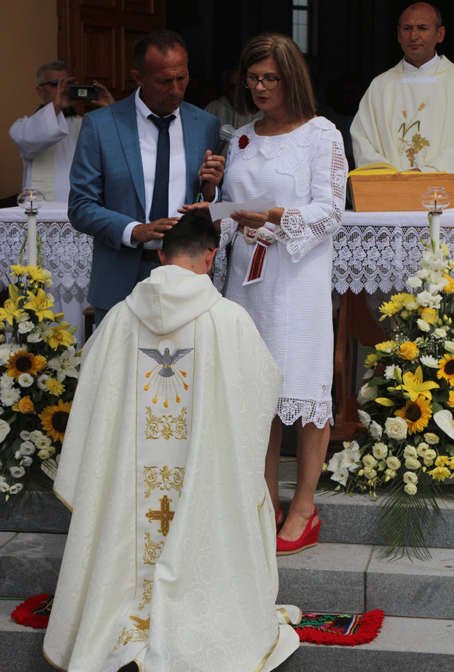 Na prvoj stepenici crkvenog stepeništa u klečećem stavu Mladomisnik je dočekao svoje roditelje Miju i Dragicu, koji podjeljuju roditeljski blagoslov. A roditelje prate kumovi: Jozo i Manda Marić.